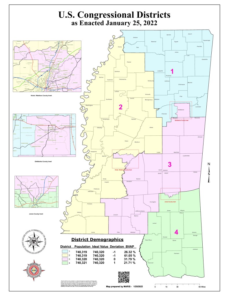 Mississippi’s 1st Congressional District now includes Alcorn, Benton, Calhoun, Chickasaw, Choctaw, Clay, DeSoto, Itawamba, Lafayette, Lee, Lowndes, Marshall, Monroe, Pontotoc, Prentiss, Tate, Tippah, Tishomingo, Union, and Webster Counties, plus a portion of Oktibbeha County.